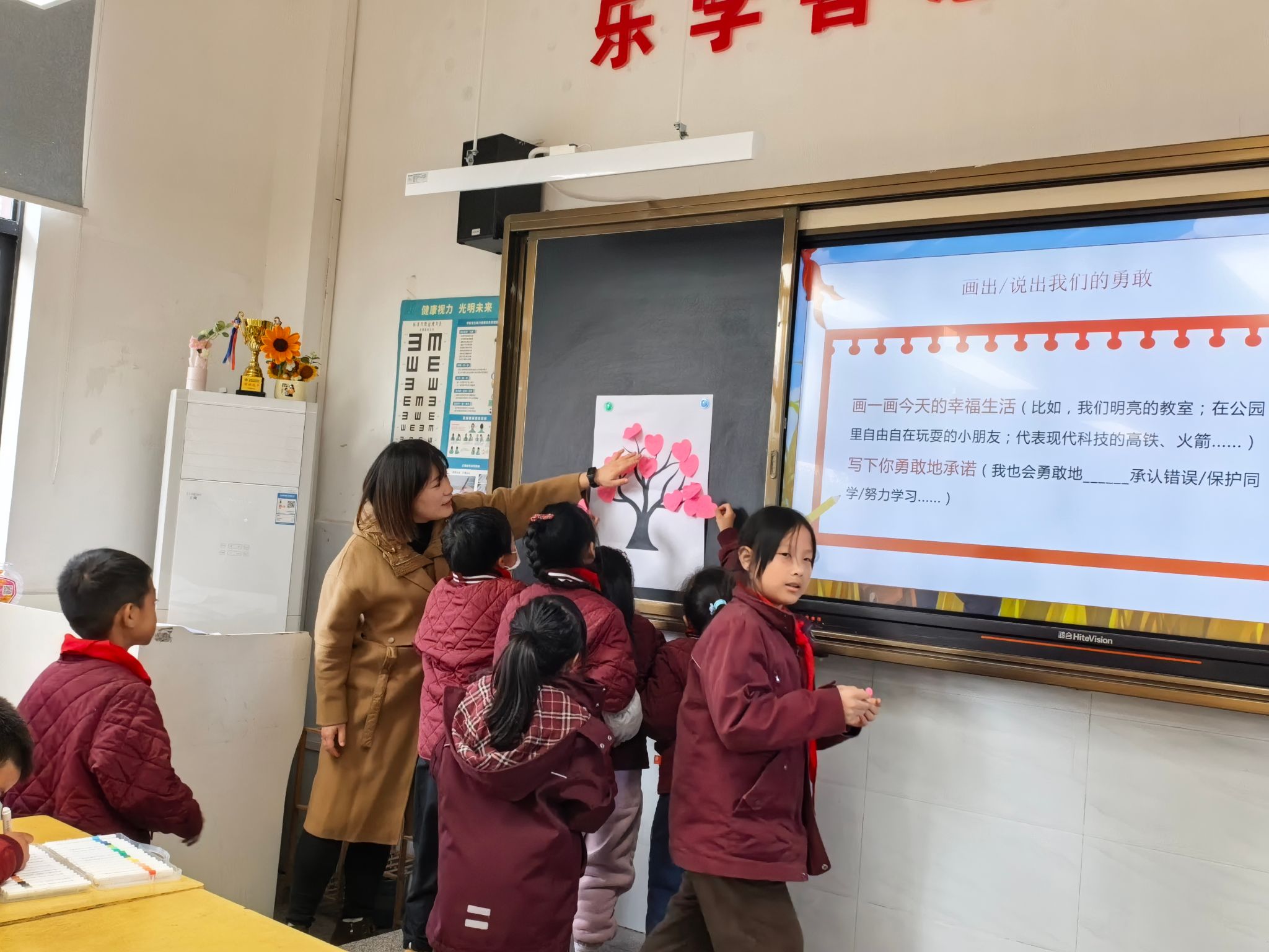 为打破传统宣讲的单向输出模式,解维娟老师设计了多个沉浸式互动环节,让孩子们在参与中深化认知、引发共鸣。在“守护我的小信念”环节,面对“朋友考试想抄答案” 的情景,教师引导学生用“我知道…… 是正确的,所以我会像何叔叔一样,勇敢地……”的句式分享想法,将英雄精神与日常行为规范相结合;在“艰难的选择”互动中,通过“轻拍桌子”与“用力跺脚”的动作选择,让孩子们亲身体会英雄在个人情感与革命大义间的艰难抉择,深刻理解何谓真正的勇敢。课堂尾声,教师还鼓励大家用画笔描绘如今的幸福生活、写下 勇敢的承诺,让红色精神转化为具体的行动自觉。