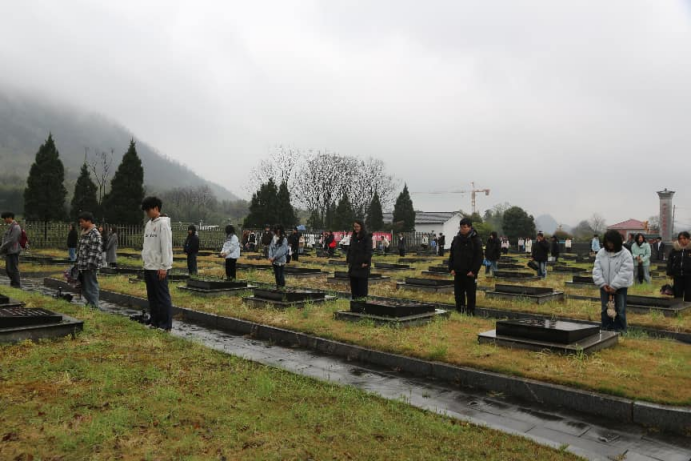 随后来到羊楼洞烈士陵园,这里安葬着142名在抗美援朝战争中负伤后,转运至羊楼洞部队医院救治无效牺牲的志愿军烈士。在烈士纪念碑前,全体师生举行了庄重的祭扫仪式:齐唱《中华人民共和国国歌》,默哀一分钟,向烈士三鞠躬,集体重温入团誓词。随后,师生们依次走到烈士墓前,认真了解每一位烈士的英雄事迹。感慨到:“没有资格替先辈原谅那些侵略者,更没有理由不珍惜现在的生活。”